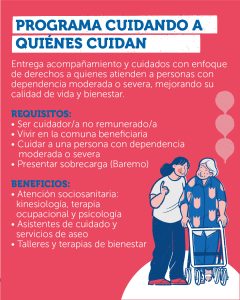 El Programa Cuidando a Quienes Cuidan brinda acompañamiento y atención socio-sanitaria a quienes cuidan personas con dependencia moderada o severa. Su objetivo es mejorar la calidad de vida y el bienestar emocional de las personas cuidadoras.